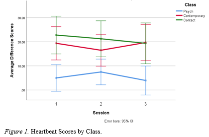 There was one fairly extreme outlier in the Contact class for the study. They were an outlier only for the heartbeat test, not for the MAIA. As the researcher, I chose to keep them in the main analysis because while their difference scores were much higher than others’, they improved with each session in a similar manner to others in their class. When analyzing with them removed, the changes over the semester were almost exactly the same, but each value was lower. With the outlier included, the means and standard deviations of the Contact class for each session in order were 19.53 (18.22), 18.93 (18.44), and 17.77 (16.48). When the outlier was removed, they drop significantly to 12.13 (8.75), 11.67(10.07), and 11.29 (9.08). The scores still improve over the semester, but the values are much lower, lower than the Contemporary class.
