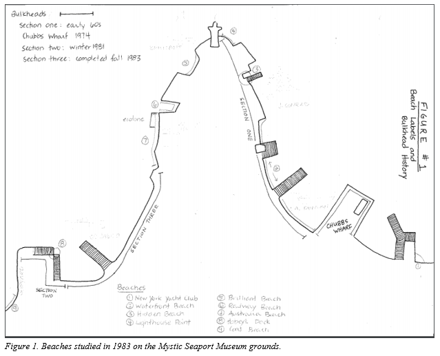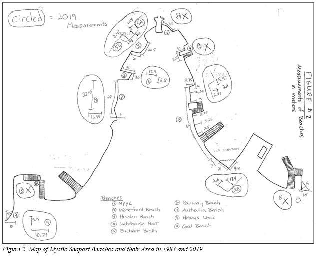 In accordance with the original experiment, we conducted various measurements on the original beaches of Mystic Seaport. The nine beaches Knopp studied were called NYC Beach, Waterfront Beach, Hidden Beach, Lighthouse Point, Brilliant Beach, Railway Beach, Australia Beach, Hobey’s Dock and Coal Beach (Knopp, 1983). See Figure 1 for a map of the Seaport Museum grounds, with Knopp’s beaches pointed out. We went to the beaches close to low tide, to measure them most accurately. The methods of collection replicated Knopp’s original study. We first “simply observe(ed)” (Knopp, 1983) the beaches she outlined, and recorded which were still there, which had been altered, and which are no longer here. We recorded “the basic physical outlay (and) geography” (Knopp, 1983) of each beach by, as Knopp did, measuring the length and width of the sites in meters, and then calculating the area in square meters, along with simply observing the prominent physical features and locations of the beaches. In some cases there were no remnants of beaches from Knopp’s original study.
