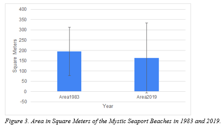 We started by comparing the physical area of the beaches. The first, most obvious observation are the differences between the number and locations of the beaches. Five beaches from Knopp’s original study remain, Waterfront Beach, Brilliant Beach, Railway Beach, Australia Beach and Coal Beach. Four beaches that were studied in Knopp’s original study, Hidden Beach, Lighthouse Point, NYYC Beach and Hobey’s Dock are no longer there. Two of the beaches, Brilliant Beach and Waterfront Beach, have been split and now are two smaller beaches each (Figure 1). In comparing the area, we combined the area of each of these pieces of beach so as to get to exactly how much land was lost. First we ran a paired sample t-test using just the surviving beaches that we measured. Despite two of her beaches being split, the total area in square meters between the 1983 beaches and the 2019 beaches was not significantly different (t-stat =0.511, p-value = 0.636). Figure 2 shows the comparison between the total area then and now. We then included the beaches that disappeared, excluding Hobey’s Dock because Knopp did not include measurements in her study. With these beaches included, there was still no significant difference in the area of the beaches (t-stat =0.806, p-value = 0.447).