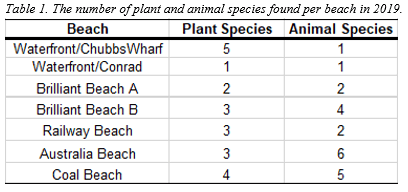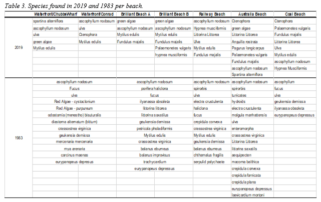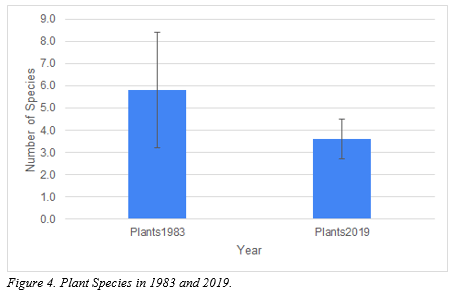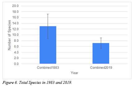 Next, we compared the species found on the beaches. The number of species found in 2019 can be found in Table 1. To compare we ran three paired samples t-tests, on the plant species, animal species, and then the total species found. There was no statistically significant difference in the number of plant species found (t-stat =1.580, p-value = 0.189). Both the animal species and the combined species were marginally significant (animals, t-stat =2.167, p-value = 0.096; combined, t-stat =2.610, p-value = 0.059) (Figures 3, 4 and 5). The means and standard deviations can be found in Table 2, there were fewer species in all three categories in 2019 than in 1983. The specific species found in 1983 and in 2019, for the beaches we were able to survey in 2019, see Table 3.