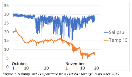 We measured the salinity and temperature over the course of October and November from the Mystic Seaport dock. We also tested the salinity and temperature once for each beach. Knopp measured the salinity four times over her project, and she didn’t collect temperature data, so we couldn’t compare our results to hers. Our temperature and salinity data for each beach can be found in Table 3 and the temperature and salinity over the semester can be found in Figure 6. The temperature steadily looks to have gone down, while the salinity doesn’t seem to have a distinctive pattern.