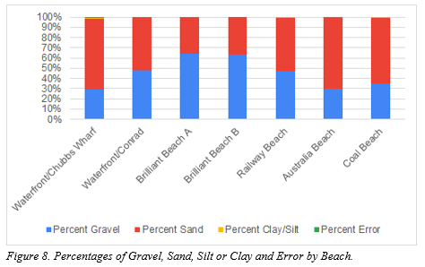 Finally, we looked at the composition of the sediment at each beach. We sieved a sample from each beach, and looked at how much was gravel, how much was sand and how much was silt. These values can be found in Table 4 and Figure 7. We couldn’t run any statistical tests to compare the beaches because we only have one data point for each, so our only conclusions were drawn by eye. It seems that the two beaches that used to be Brilliant Beach have quite similar compositions, whereas the two beaches that used to be a part of Waterfront Beach looked more different. Australia Beach, Waterfront/Chubbs Wharf and Coal Beach had the most sand, where Brilliant Beach A and B had the most gravel. None of the beaches had more than a few tenths of a gram of silt or clay.